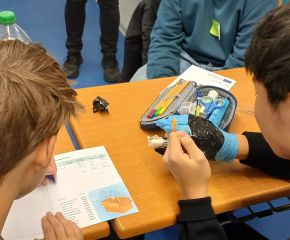 An vier Tagen kamen junge MINT-Akademikerinnen und Akademiker der Initiative mit einem interaktiven Vortrag, Experimenten zum Mitmachen und Technik zum Anfassen an die Schule. Gemeinsam mit den Schülerinnen und Schülern erforschten sie praxisorientiert das Thema Medizintechnik. In insgesamt acht Unterrichtsstunden setzten sich die Jugendlichen intensiv mit modernen Technologien im Gesundheitssektor auseinander und experimentierten unter anderem mit Mikroskopen, EMGs, EKGs und Schnelltests. „Danach waren sie gefordert, in Teams ihre eigenen Prototypen einer aktiven Handprothese zu designen und zu bauen“, erklärt Pascal Hauser von der IJF. „Zusätzlich lernten sie kreative Methoden wie Design Thinking kennen. Wir fördern damit Kreativität, Empathie und Teamgeist.“